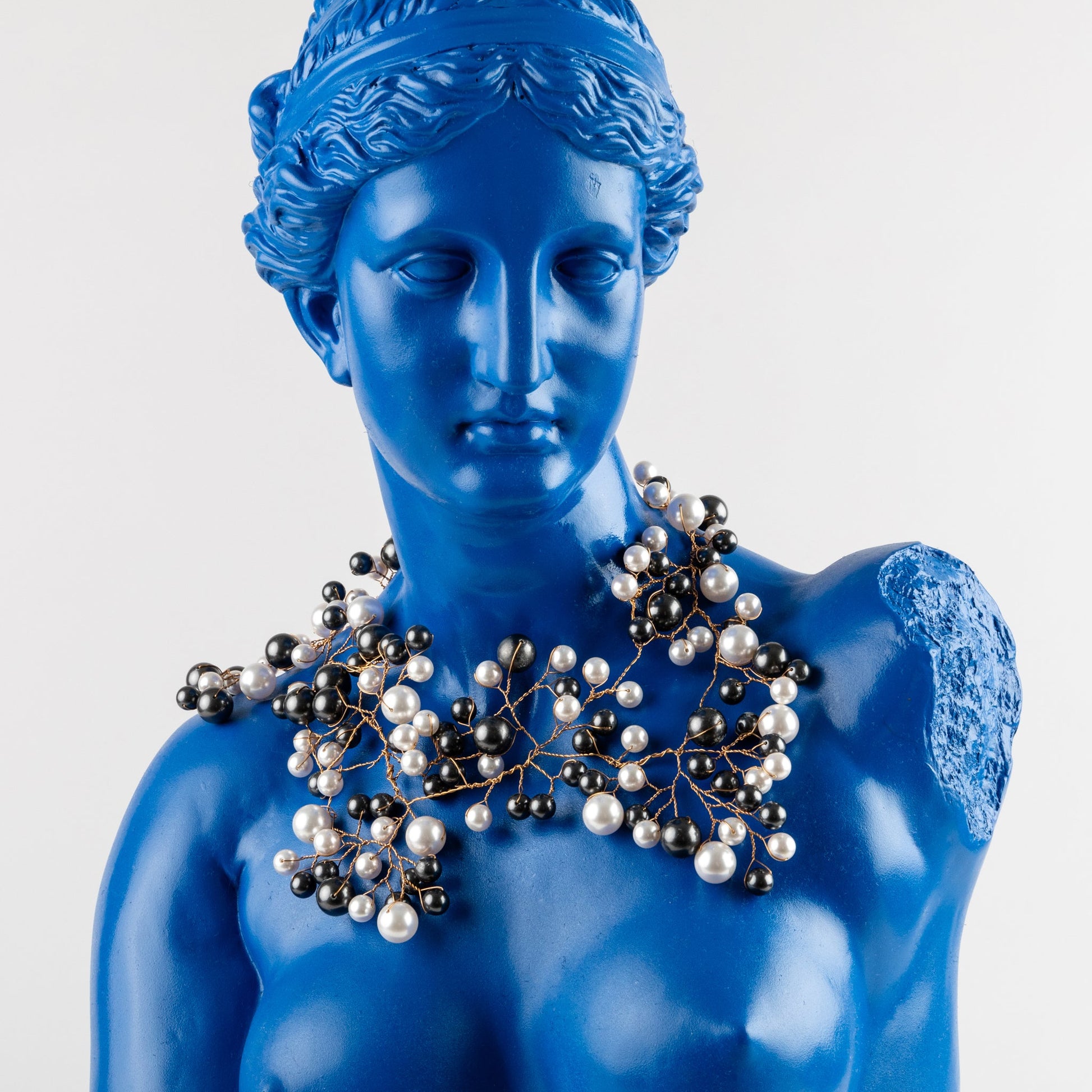 Crafted from a mix of black and ivory crystal pearls from Swarovski and silver plated wire.