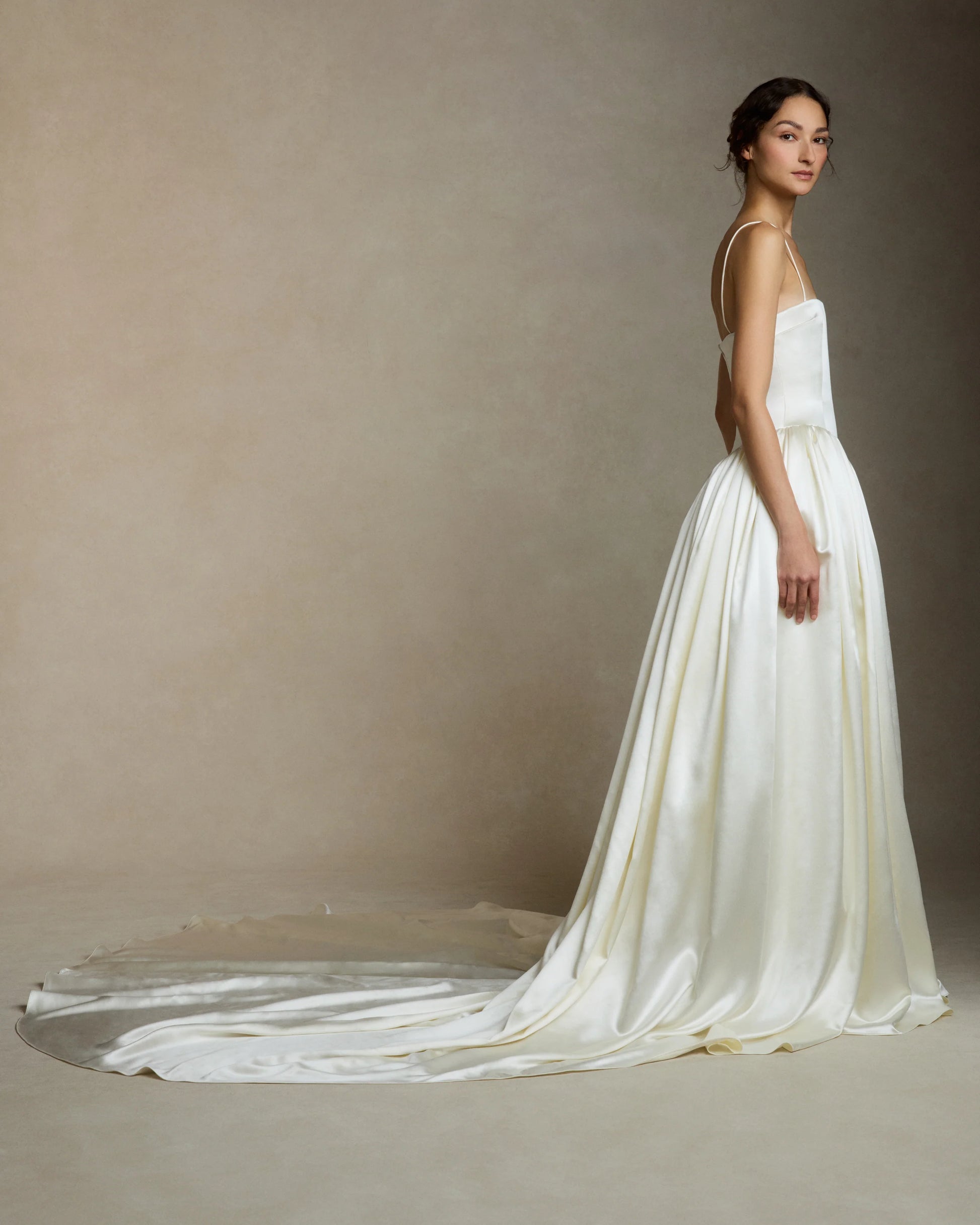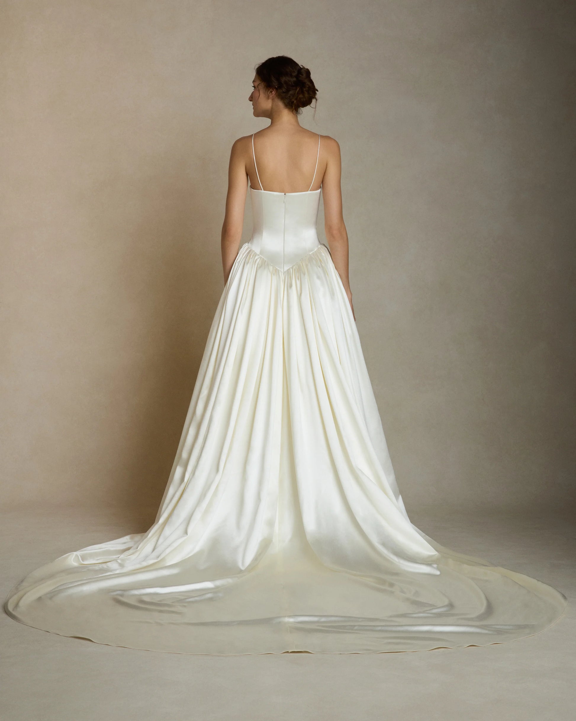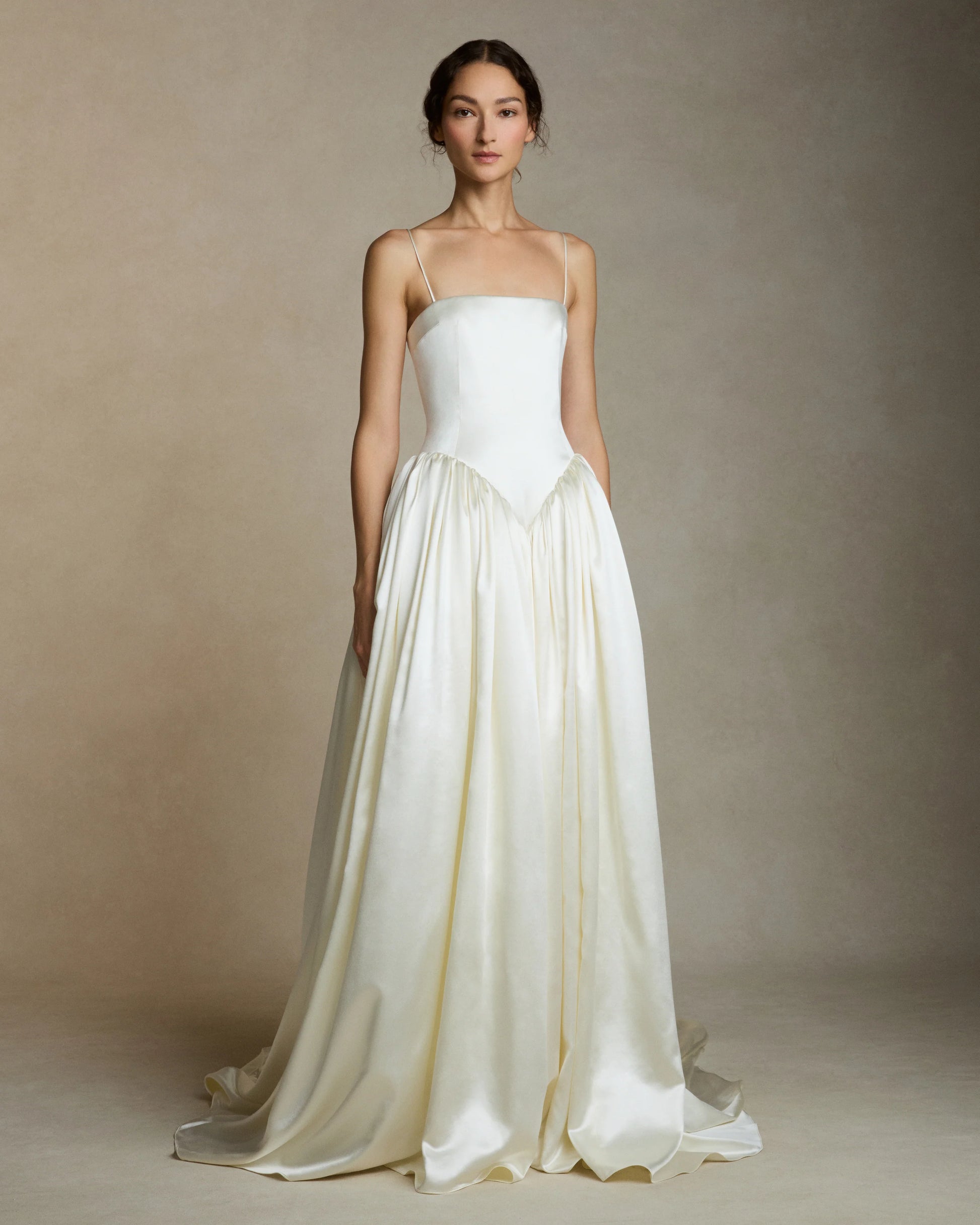 Detailing and Finish: A classic bridal gown with a modern twist: the structure bodice is suspended on thin spaghetti straps, and drops dramatically into gathers in the waistline.