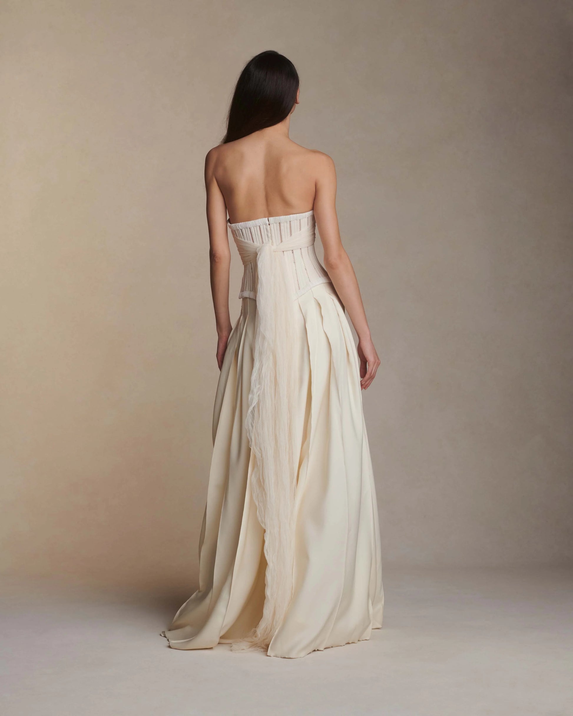 Detailing and Finish: Anika features sheer lace detailing between the boning of the bustier, and finished with exaggerated soft tulle pleated streamers that flow from the bust.