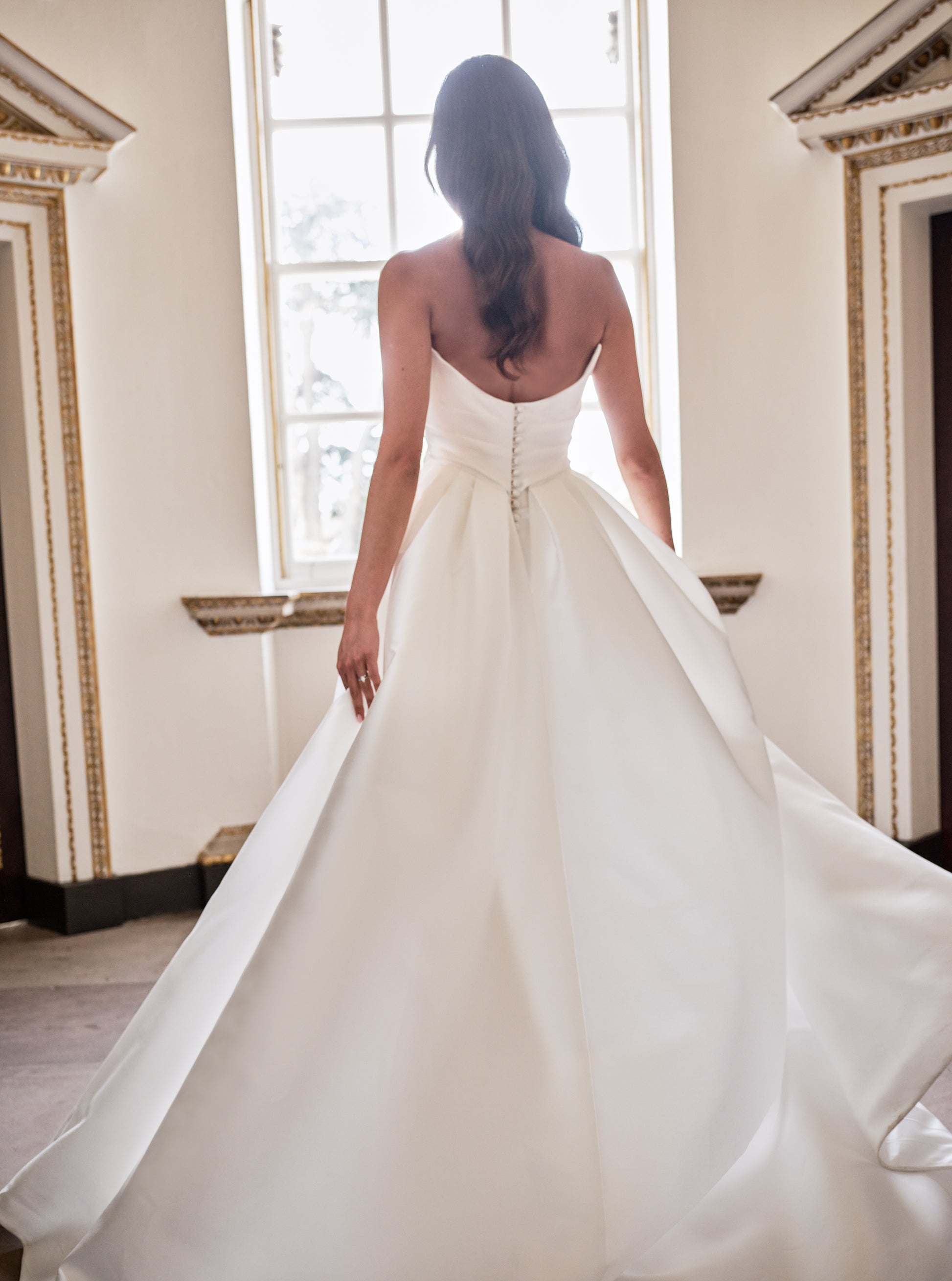 Bodice: Strapless ruched bodice with subtle Basque waist detailing and scoop back.