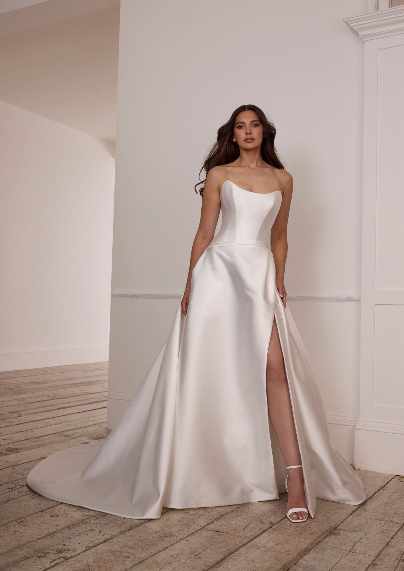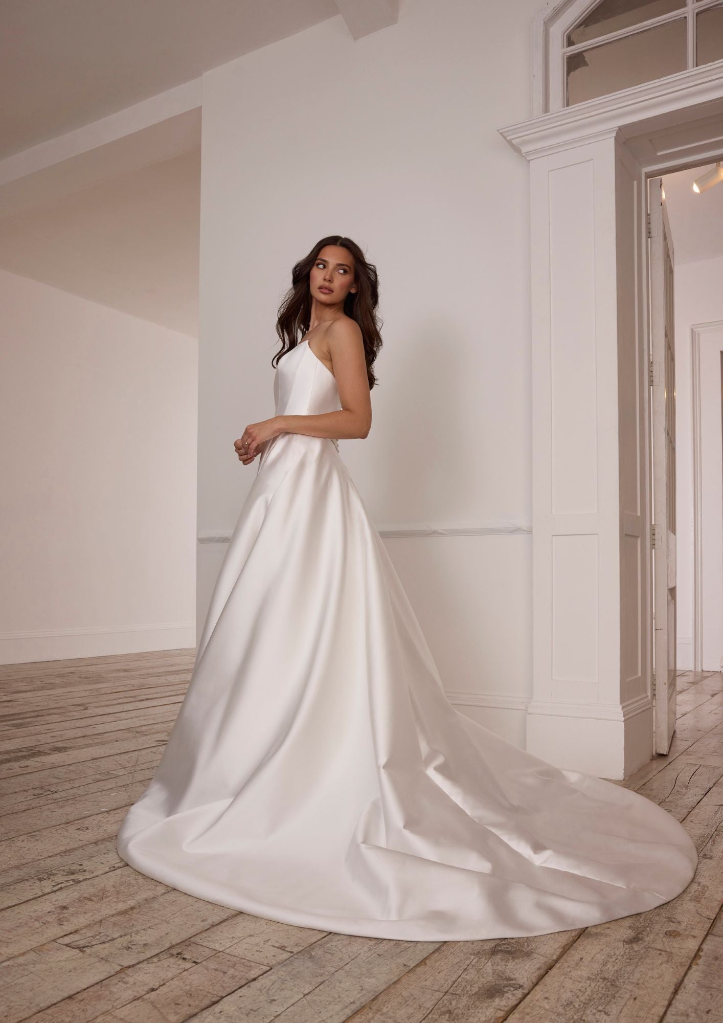 Detailing and Finish: Aster is the classic bridal gown reimagined, with an unexpected asymmetric waistline and thigh-high split that gives it a real modern edge. Crafted in luxurious fine Mikado to really hold its shape. Finished with classic bridal buttons down the centre back of the dress.