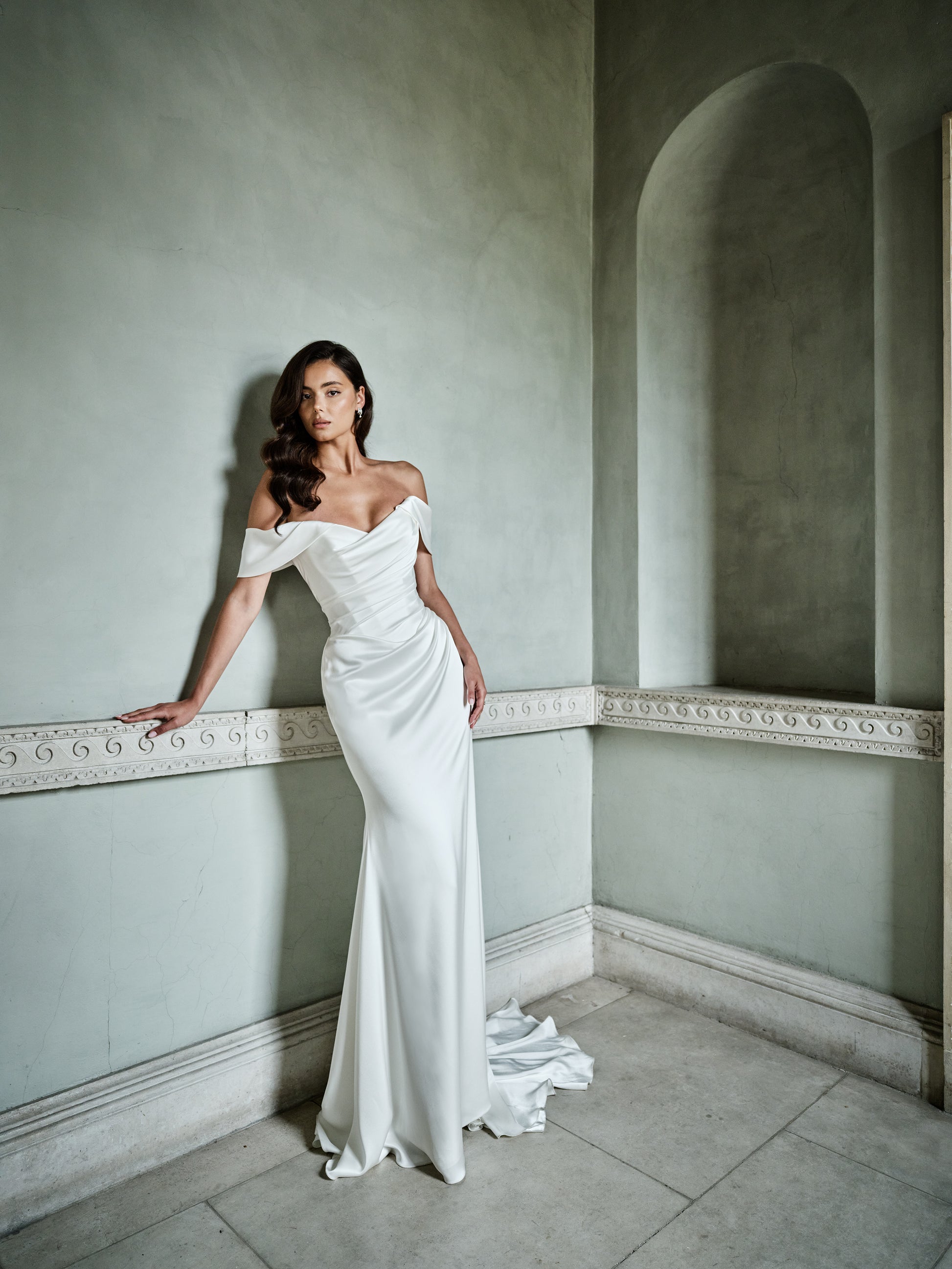 Detailing and Finish: A modern classic – the Eternelle dress is a must-see. The fabric is artfully draped, highlighting the silhouette of the wearer and the boning of the inner corset. The soft v-neckline is mirrored in the subtle yet flattering Basque waistline of the bodice. Can be worn with or without the off-shoulder straps. Finished with a classic line of bridal buttons down the centre back.