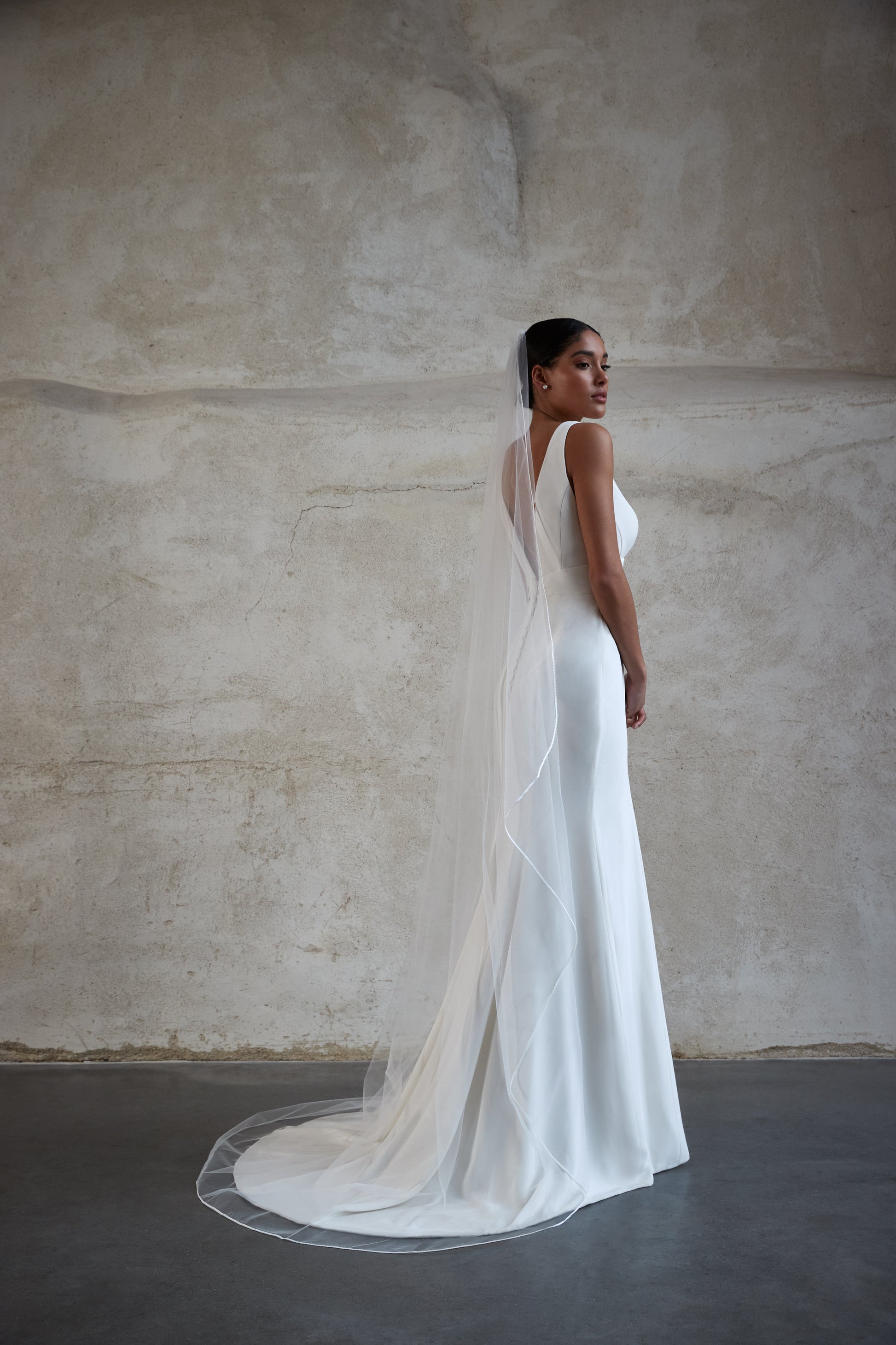 Pictured: model is wearing a single tier French Braid veil in the Long length (90"). Bespoke lengths also available.