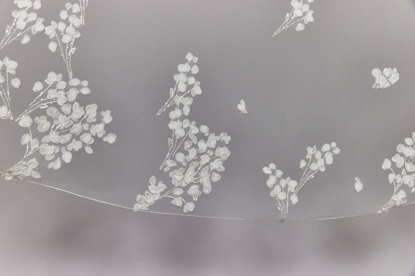 This veil has a floral abstract patterned lace that gradually scatters up the veil. There is a clear sequin in the applique to provide a bit of light catching sparkle.