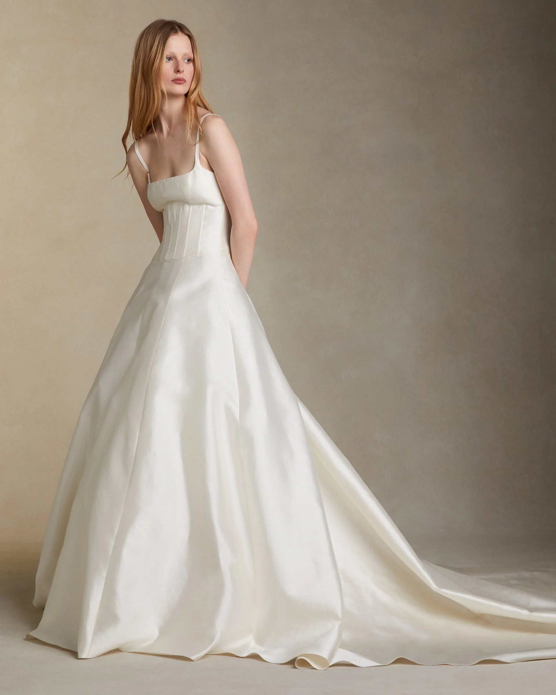 Detailing and Finish: Pia features outer boning details in the bodice to accentuate the figure, an invisible zip closure in the back, and wide panelling in the skirt for volume.