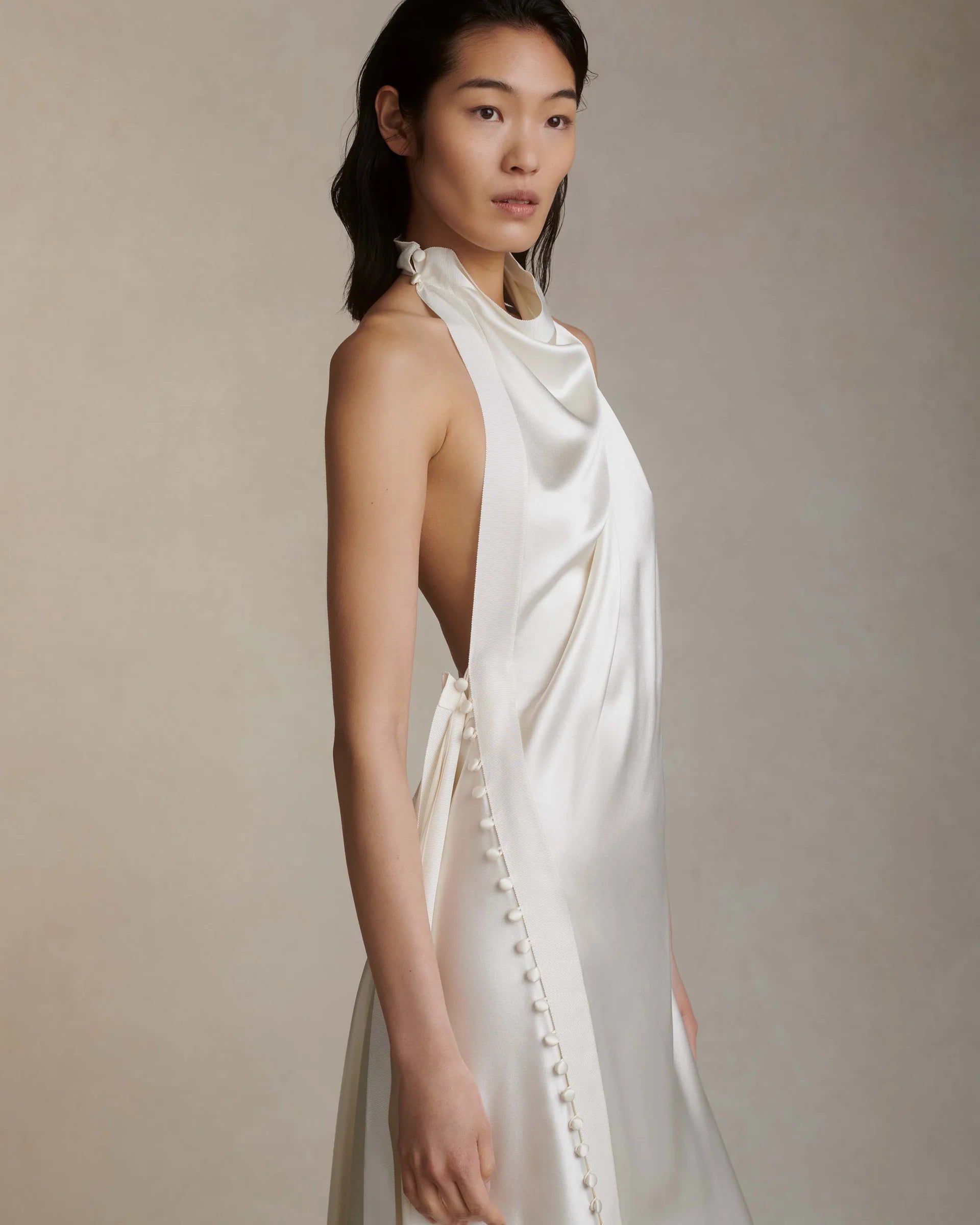 Detailing and Finish: Slip on handkerchief style dress with grosgrain edging and button detail along the side hip and neck.