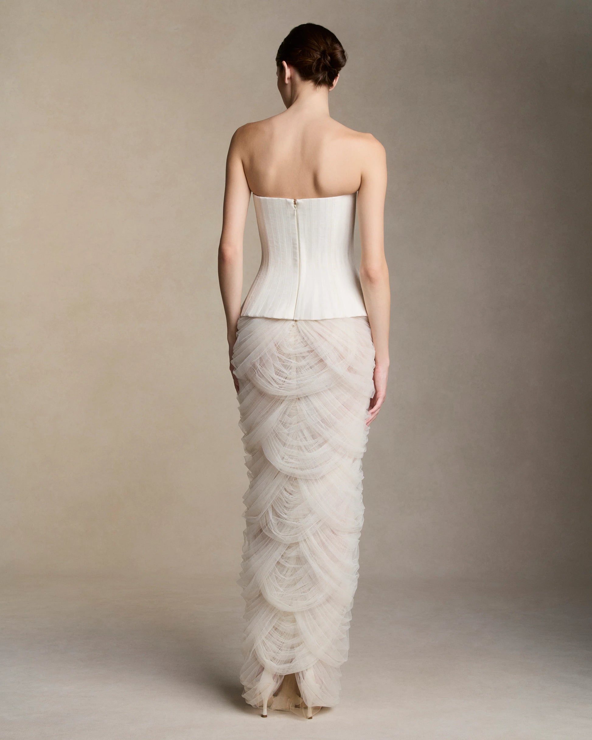 Detailing and Finish: Visible grosgrain boning detail, giving a structured look and finish. Features invisible zip closure in the centre back. Pictured here with the Cosette skirt, which can be ordered directly from Danielle Frankel’s website.